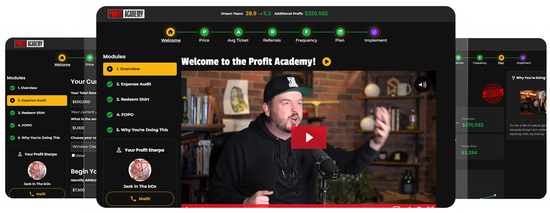 The Profit Academy program itself is delivered in bite-sized video modules (most under 10 minutes) that you can consume at your own pace. But here's what makes this different - it's not about watching videos, it's about creating your custom Profit Plan.