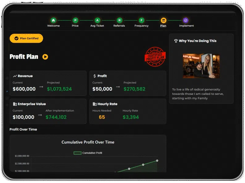 As you complete each mission, the Profit Plan Builder automatically calculates your potential profit increase, implementation timeline, and exact next steps.
